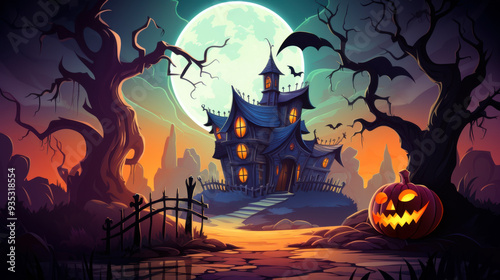 Halloween night with a spooky house, pumpkins and bats, Halloween background. Jack O' Lantern in front of haunted house