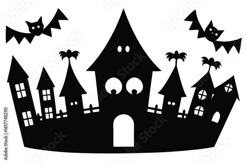 halloween, party, vector, icon, house, castle, cartoon, illustration, building, town, architecture, home, city, night, village, design, fantasy, art, tower, sky, silhouette, fairy, princess, fortress, roof, drawing