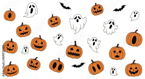 Halloween pattern featuring pumpkins ghosts and bats on a white background