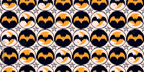 Halloween Pattern with Orange and Black Bat Silhouettes in Circle Grid on White Background. Simple and spooky moonlight bats with stars perfect for print, web, fashion, cards, wrapping paper