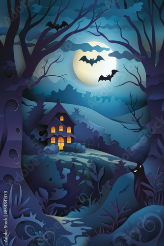 paper, halloween, cut, bat, tree, silhouette, forest, three-dimensional, background, pumpkin, banner, frame, cartoon, blue, card, invitation, moon, celebration, border, holiday, night, season, decoration, decor, ghost, element, lantern, greeting, creepy, dark, horror, october, scarey, skittish, treat, trick, house, haunted, autumn, castle, bat