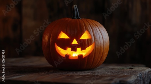 Halloween pumpkin glowing in the dark with an eerie expression on a rustic table