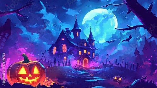 Halloween pumpkin in front of haunted house, cartoon style, bright colors, mobile game background, casual art, mobile wallpaper, mobile background