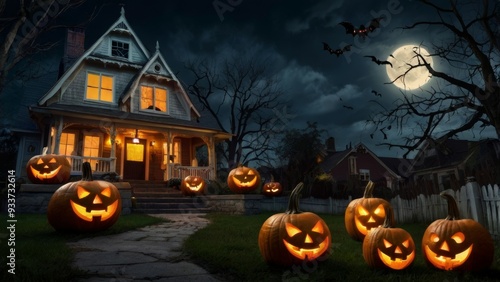 background, halloween, pumpkin, evil, haunted, event, jack, skittish, nightmare, devil, moonlight, ghost, moon, bat, party, candle, illuminated, full moon, landscaped, colourful, midnight, magic, darkness, vignetting, smile, death, shock, silhouette, autumn, night, horror, holiday, illustration, dark, scarey, october, celebration, tree, design, orange, black, house, cartoon, fear, card