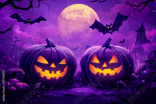 Halloween pumpkin on purple scary background with bats and full moon