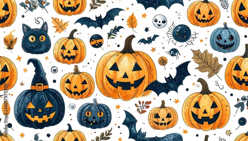 halloween, pumpkin, pattern, skittish, bat, leaf, cat, spider, ghost, sorcerer, hat, orange, black, white, cute, cartoon, design, illustration, seamless, floral, decor, graphic, fall, autumn, celebration, symbol, print, background, vector, texture, art, style, digital, image