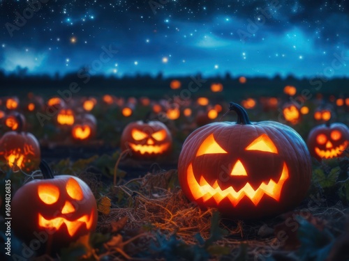 halloween, pumpkin, field, night, sky, star, skittish, carved, lit, glowing, orange, darkness, autumn, harvest, scarey, creepy, decoration, holiday, celebration, lantern, vegetable, agriculture, rural, nature, farm, light, illuminated, autumn, ghost, fantasy