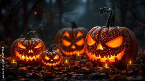 halloween, pumpkin, carving, jack-o-lantern, candle, skittish, fall, autumn, leaf, glowing, orange, festive, holiday, mist, darkness, trick or treat, horror, celebration, seasonal, dark background, fall leaf, eerie, creepy, candlelight, pumpkin, scarey, evil, decoration