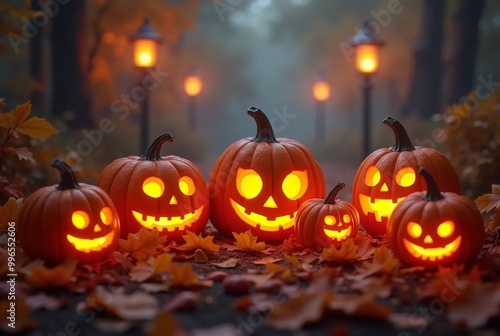 Halloween Pumpkins with Glowing Faces in the Fall Evening
