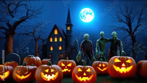 Halloween Scene - Party Of Pumpkins And Zombies In Graveyard At Moonlight - Contain Moon 3D Rendering - Unrecognizable, Deformed And Church with Reassembled Parts