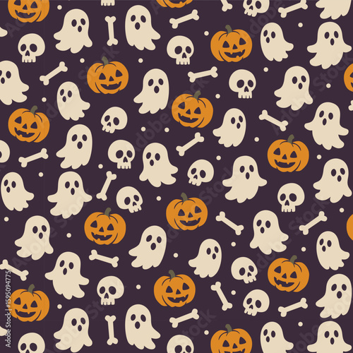 Halloween seamless pattern with ghosts, pumpkins, skulls, and bones on dark background — spooky cute holiday design for fabric, wallpaper, and party decorations