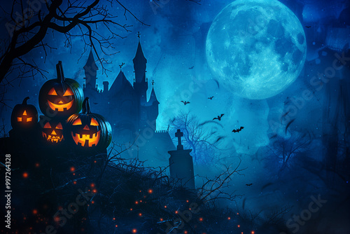 Halloween spooky background with copy space. Silhouette of the which castle, pumpkins, bats, graveyard, trees. High quality photo