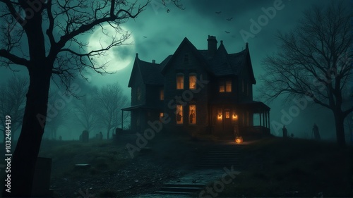 night, house, moon, halloween, sky, home, illustration, tree, vector, architecture, silhouette, city, dark, skittish, landscape, haunted, cartoon, scarey, bat, castle, village, horror, town, star, holiday