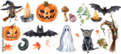 Halloween symbol single element set. Hand drawn autumn festive halloween collection. Watercolor toad, garland illustration. Scary Jack head pumpkin, black cat, bat, ghost, broom white background