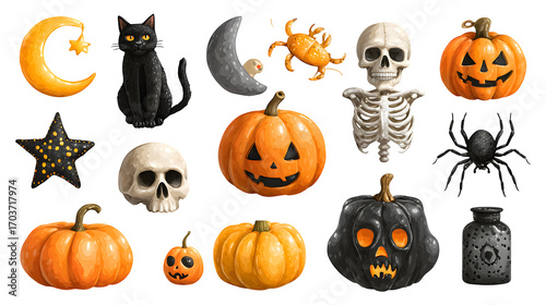 Halloween symbols vector set including crescent moon, cat, star, skeleton, spider, and pumpkins, isolated on white background