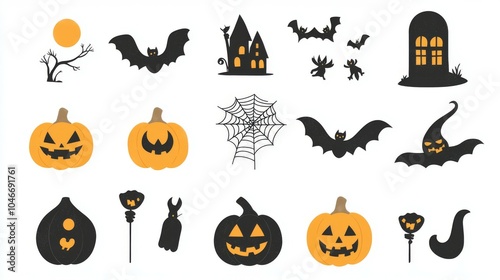 halloween, pumpkin, vector, bat, autumn, illustration, holiday, night, horror, moon, skittish, scarey, october, cartoon, celebration, orange, design, ghost, set, silhouette, black, cat, tree, dark, castle