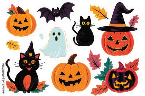 Halloween themed illustrations featuring pumpkins cats bat ghost and autumn leaves isolated on white background