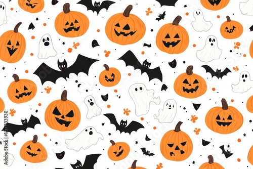 Halloween themed pattern featuring pumpkins ghosts and bats on a white background repeat design