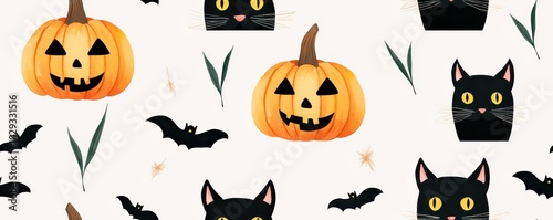 Halloween themed pattern with pumpkins, bats, and black cats., Tile , Seamless Pattern