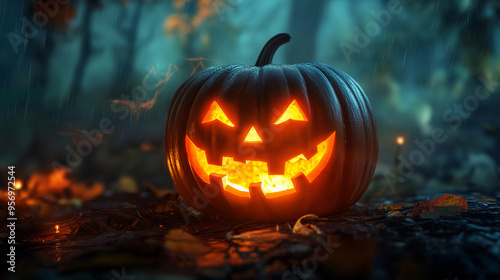 Halloween themed pumpkin with scary lighting face on beautiful background