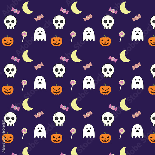 Halloween themed seamless pattern, with skulls, crescents, pumpkins, candy, lollipops and ghosts, on a purple background.