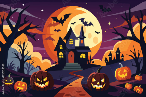Halloween vector illustration background of celebrating a Halloween party. The scene is filled with a haunted house, pumpkins, bats. Halloween banner design template