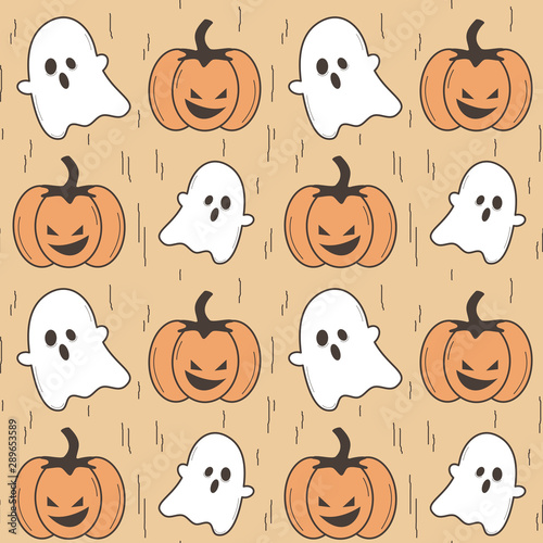 halloween vintage seamless vector pattern background illustration with cartoon pumpkins and ghost