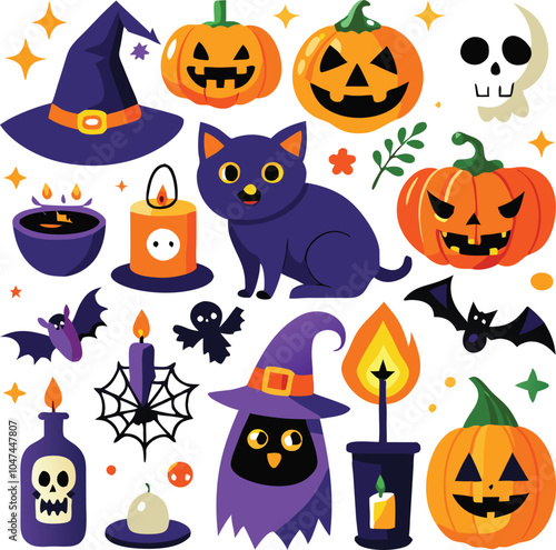 halloween, sorcerer, cat, pumpkin, skittish, decor, element, hat, black, orange, skull, candle, cauldron, bat, spider, web, icon, illustration, design, holiday, celebration, party, creepy, cute, fun, festive, seasonal, october, trick, treat, ghost, monster, magic, magician, fantasy, night, dark, scarey, boo, costume, masquerade, celebratory, decorative, graphic, vector, clip art