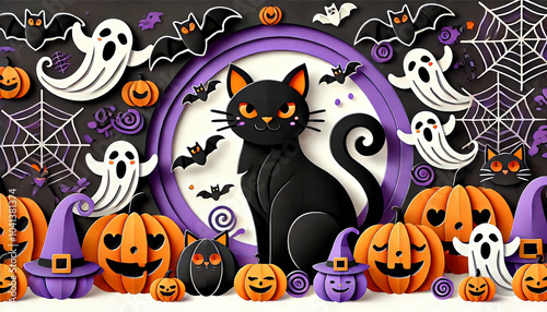 Halloween-Themed Background with Black Cat, Pumpkins, Ghosts, and Bats.