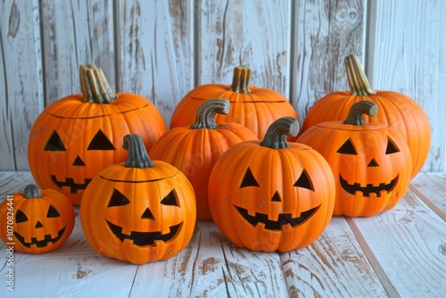 Halloween-themed decoration featuring orange pumpkins on white plank background