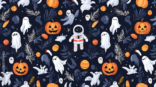 Halloween-themed space adventure with ghosts and pumpkins whimsical pattern dark background playful concept