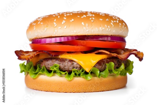 burger, hamburger, food, cheeseburger, cheese, beef, sandwich, bread, bun, meat, lettuce, fast, tomatoes, isolated, meal, white, fat, lunch, dinner, unhealthy, onion, snack, salad, delicious, sesame