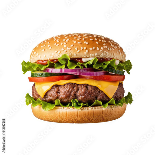 food, hamburger, burger, sandwich, bread, cheese, bun, lettuce, meat, cheeseburger, beef, tomatoes, fast, isolated, lunch, meal, white, snack, onion, dinner, unhealthy, delicious, fat, closeup, salad