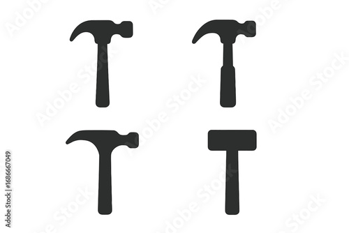 Hammer icon set in a minimalist black silhouette style. Vector graphic collection of various tools like claw hammer, sledgehammer, and mallet for construction or repair work.