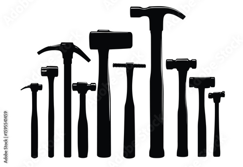 hammer, tool, silhouette, collection, set, construction, equipment, repair, isolated, vector, illustration, icon, work, metal, white, steel, carpenter's shop, tool, object, hardware, hand, handle, improvement, build, black, iron, wrench, industrial