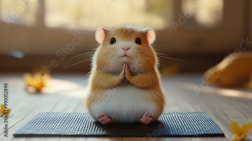 Hamster doing yoga poses on a mat, peaceful expression, relaxing vibes, cartoon style