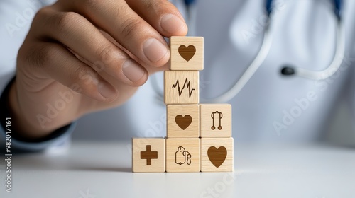 Hand arranging wooden blocks with healthcare icons, modern medical support