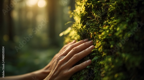 Hand berührt moosbedeckten Baum im Sonnenlicht des Waldes