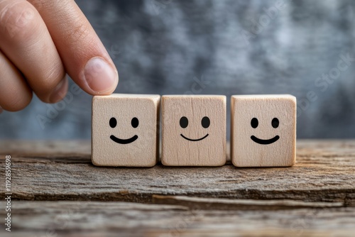 Hand chooses a emoticon icons healthcare medical symbol on wooden block , Healthcare and medical Insurance concept