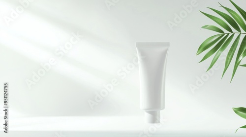 Hand cream tube hovering over a serene, white background with subtle shadows, hand cream mockup, minimalist and airy.