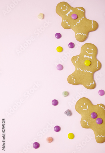 Hand decorated gingerbread men on a pastel pink background with sweets arranged to form a page frame