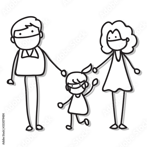hand drawing cartoon character people in family wear mask protection from Covid-19