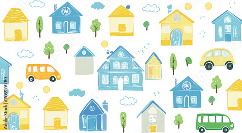 hand drawing seamless pattern with houses for kids.graphic, children, elegant, grey, minimalist, monochrome, print, window, cosy, drawing, fabric, hand-drawn, repeat, simple, sketchy, vignetting,