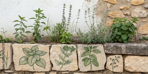 Hand drawn collection of herbs on a stone wall, illustration, stone walls, rustic decor