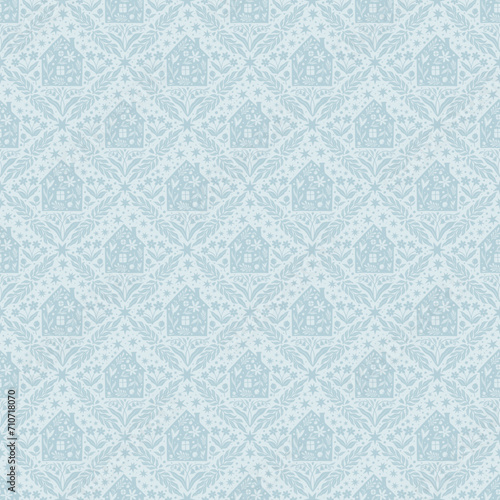 Hand drawn doodle cartoon houses and flower silhouette seamless pattern, cute house seamless texture