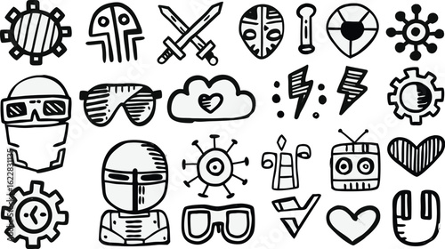 doodle, icon, vignetting, robot, sword, nubes, lightning, mask, gear, face, tech, gaming, goggles, hand-drawn, cartoon, cyber, comic, cool, nerd, geek, retro, cute, bold, outline, vector, set, icon, symbol, illustration, signs, silhouette, energy, tree, hand, design, nature, black, ecology, web, eco, globe, leaf, water, sun, element, car, toy