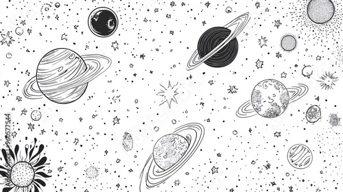 space, planet, star, galaxy, universe, celestial, cosmos, astronomy, solar, system, cosmic, night, sky, background, art, drawing, vignetting, doodle, illustration, hand, drawn, design, pattern, white, black, simple, minimalism, abstract, whimsical, dreamy, fantasy, science, exploration, imagination, outer, nebula, saturn, jupiter, mars, venus, earth, sun, moon, and, line