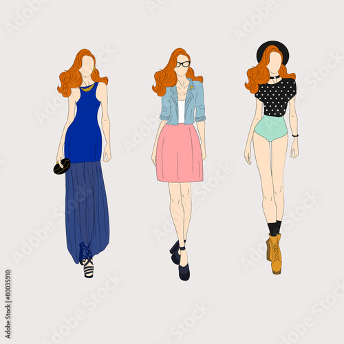 girl, fashion, fashionable, drawing, sketch, vector, shoe, cute, trend, hair, printing, modern, skirt, mix, cartoon, hand-drawn, clothing, friends, blond, attractive, clothes, new, press release, active, accessory, feminine, different, black, female, suit, dress, illustration, figure, woman, outfit, young, design, group, colourful, adorable, beauty, style, beautiful, bag, costume, uniform, shop, girl