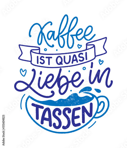 Hand drawn funny lettering quote about Coffee in German - Coffee is like love in cups. Inspiration slogan for print and poster design. Cool for t shirt and mug printing.