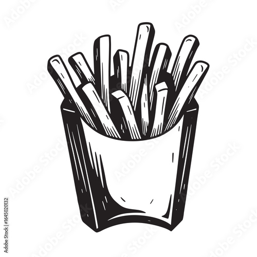 french fries, fries, fast food, take-away, box, container, food, snack, side dish, hand-drawn, illustration, black-and-white, monochrome, vintage, retro, doodle, vignetting, line art, simple, isolated, white background, unhealthy, eatery, potato, crispy, comfort food, junk food, craving, appetence, delicious